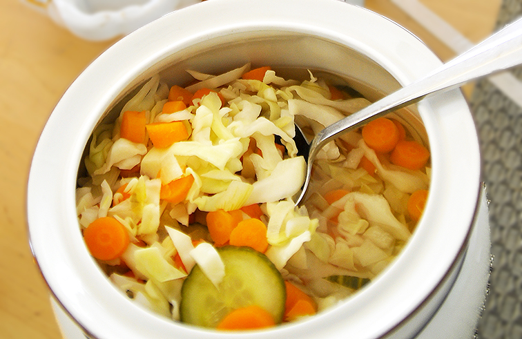 Breng het water aan de kook met zout, suiker en peperkorrels. Kook hierin de in stukjes gesneden worteltjes 6 à 8 minuten mee. Voeg er daarna de azijn aan toe en roer er de rest van de in stukjes gesneden groenten doorheen. Laat de massa 2 minuten doorkoken. Niet houdbaar!