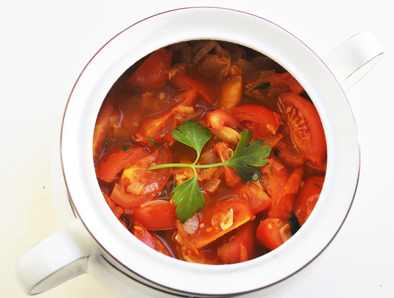 Ik heb mijn best gedaan om de kruiden goed samen te wrijven. De smaken komen daardoor echt los en dit gerecht krijgt daar die specifieke kick van. Je kan kiezen voor een groentebouillonblokje om het geheel vegetarisch te houden. Ik gebruik hier rundvleesbouillon. Het is een wat sterker contrast met de tomaten, maar dat is smaak. Ik heb dit gerecht geserveerd met gestoofde garnalen met petehbonen. Ook goed te combineren met deze garnalen.
