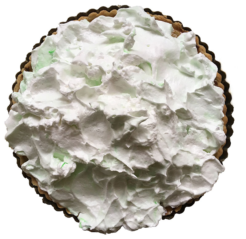 Bovenop de taart schep ik een dikke laag eiwitschuim (meringue) waardoor ik drie druppels pandan meng. Ik ga er dan twee keer met een lepel door en zo ‘marmert’ de schuim met de kleur groen. Het lijkt wel lente, alhoewel dit ook een fantastisch taartje is voor kerst.