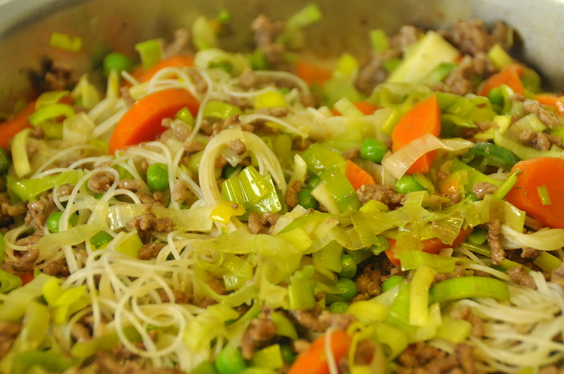 Dan bak ik de winterpeen en daarna al snel het gehakt. Daarbij doe ik dus een groentenbouillonblokje. Dan kan de prei erbij, de erwten en de uitgelekte laksa.