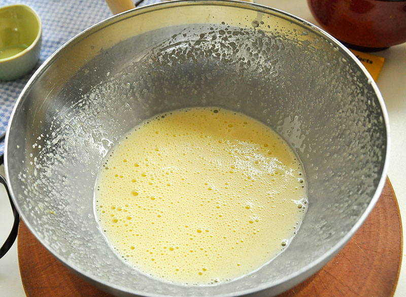 Doe ei, suiker, bloem, melk en zout in een kom en mix het een paar minuten flink met de mixer, zodat het mooi lichtgeel en luchtig wordt.