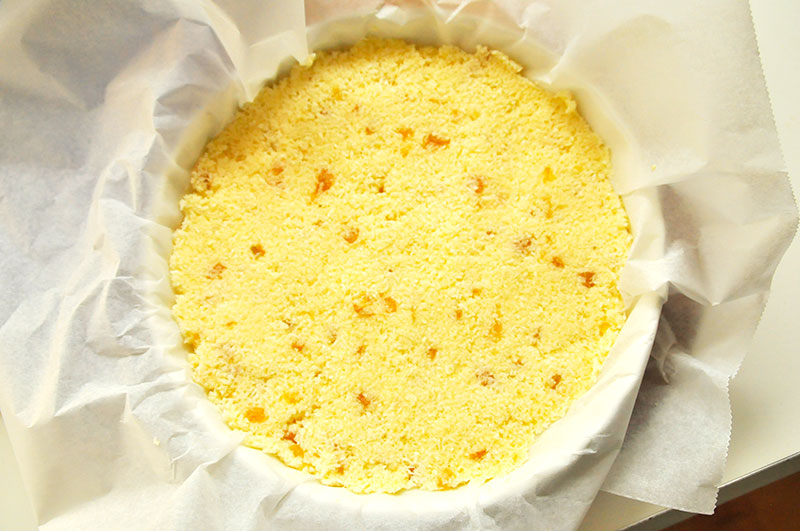 Leg bakpapier in de ovenschaal en verdeel het dikke beslag netjes over de bodem. Duw het een beetje aan en zorg voor een gladde, strakke bovenkant.