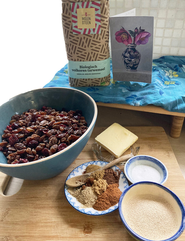Meng het meel, zout, gist en boter (op kamertemperatuur) in een grote schaal. Alle specerijen gaan er direct bij. Ik doe handwarm water erbij, beetje voor beetje en kneed alles tot een elastisch deeg. Dat duurt ongeveer 10 minuten. Als het deeg soepel is, gaan de rozijnen en de volle hand cranberries erdoor. Het doorkneden van het deeg met de rozijnen is best moeilijk, maar hou vol, uiteindelijk verdelen de rozijnen zich goed. Nu mag het deeg 1 uur rijzen op een warme, niet tochtige plaats. Ik leg er een theedoek overheen.