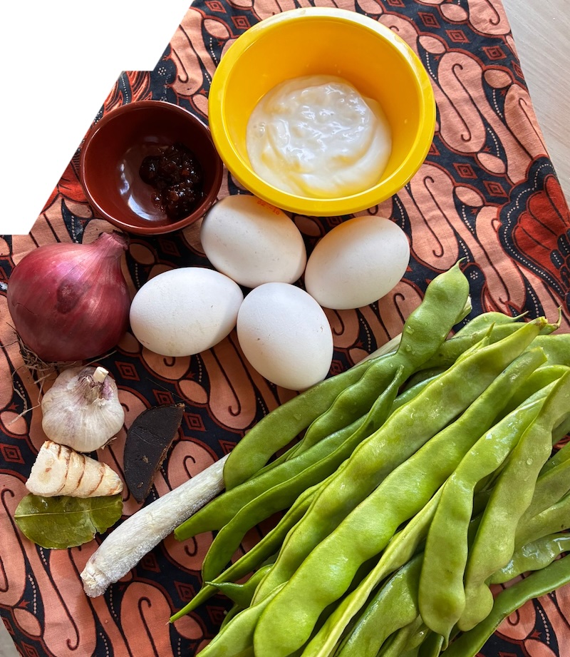 Ik heb geen sambal goreng over, maar heb wel veel bonen uit mijn moestuin over. Ik roerbak deze met verse laos, jeruk purut, sereh (citroengras), gula Jawa, een ui en knoflook. Ook gaat er uiteraard sambal doorheen en giet ik er ook wat kokoscrème bij. Maar elke sambal goreng volstaat. In het hoofdstuk sambal gorengs staan er verschillende. Ik laat het vocht uit de sambal goreng uitlekken zodat deze niet te nat wordt en gebruik wat vocht voor de omelet.