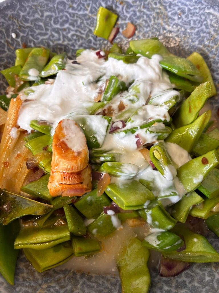 Op het laatst kan de kokoscrème erbij en laat ik alles nog een paar minuten sudderen.