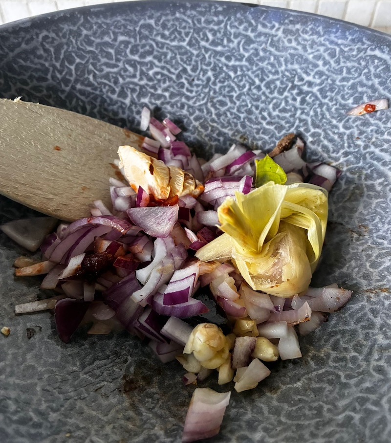 Uiteindelijk had ik toch te veel saus bij de eieren gedaan en werd de omelet te slap om deze goed om te draaien, maar het werd wel mooi en lekker. Ondertussen wok ik de uien, knoflook en andere ingrediënten om mijn sambal goreng te maken.