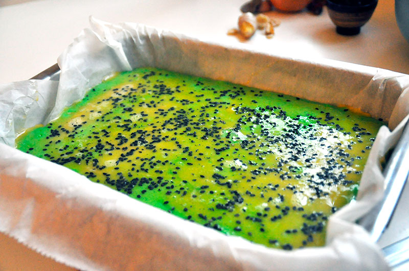 Ik haal het uit de oven en smeer voorzichtig (het is nog zacht) een geklutst ei op de bovenkant. Dan sprenkel ik wat zwarte sesampitjes erover voor een mooi effect.
