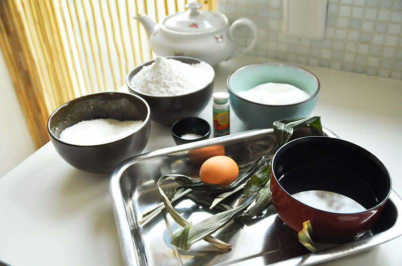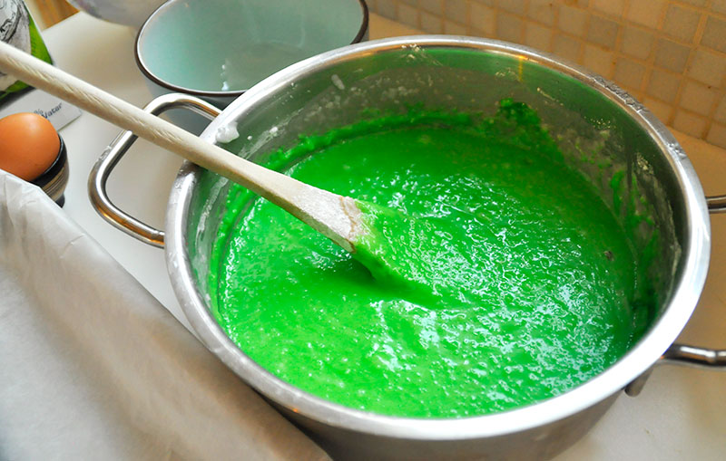 - Ik haal het pandanblad er nu uit en voeg 1,5 theelepel pandanextract toe.