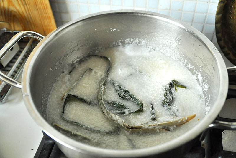 Doe suiker, zout, pandanbladeren en 200 ml kokoswater in de pan en breng aan de kook totdat het suiker is opgelost.