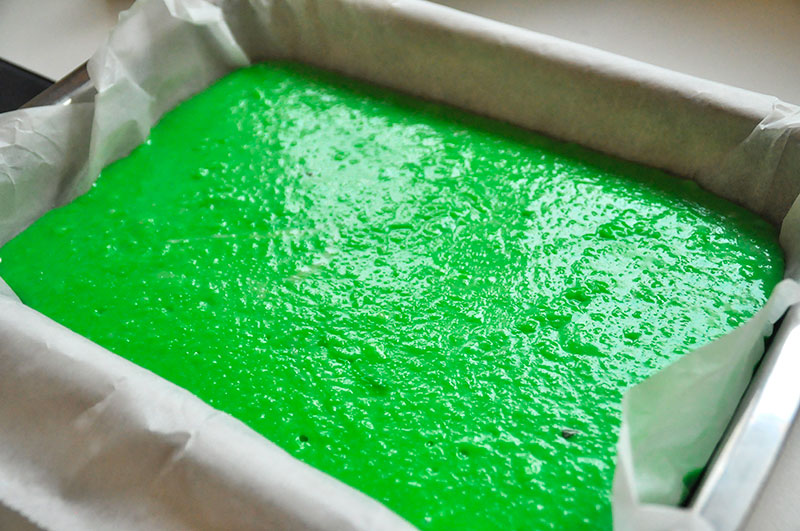 - Ik giet het beslag in de bakvorm op het bakpapier.