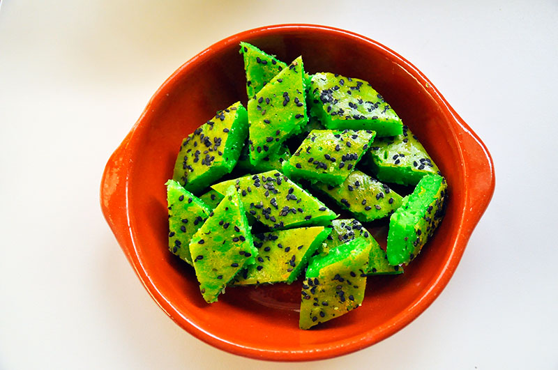 Online zijn veel verschillende recepten te vinden. Met of zonder kokosmelk of boter, wit van kleur of groen, met een ei door het beslag of juist alleen er boven op, met of zonder sesamzaadjes.